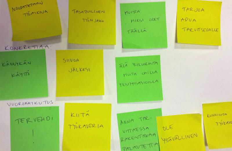 Turussa seinätauluja suunniteltiin toimivan työyhteisön tueksi. Toimiva Työyhteisö koostuu useista eri elementeistä. Pelisääntöjen kertaaminen ajoittain luo vankan pohjan toimivalle työyhteisölle.